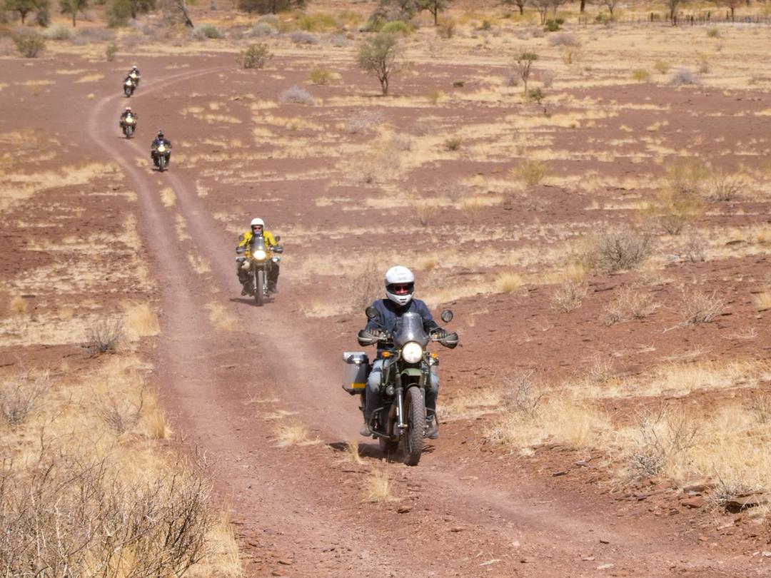 Meet your Royal Enfield and receive a trip briefing. Ride south to Rehoboth and then west into the red sand Kalahari. Enjoy a short game drive before sunset.